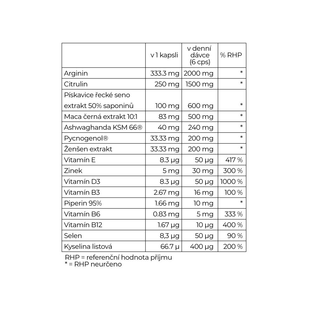Arginin hydrochlorid, Citrulin, pískavice řecké seno extrakt, Maca peruánská extrakt 10:1, Ashwagandha KSM 66, Pycnogenol (french maritime pine bark extract), Ženšen extrakt, Citrát zinečnatý, Seleničitan sodný, Tokoferol, Cholekalciferol, Nikotinamid, Kyselina listová, Kyanokobalamin, Pyridoxin hydrochlorid, Piperin.